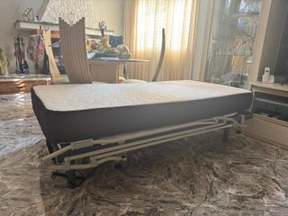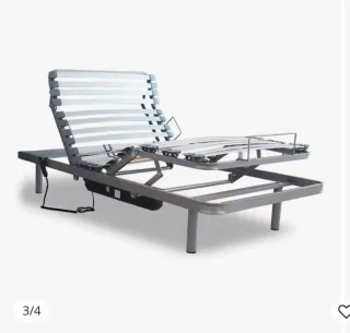 Cama ortopédica articulada eléctrica con poco uso. Su diseño combina una estructura metálica con láminas de madera. - Mecanismo de articulación eléctrica. - Base de láminas de madera.