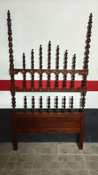 Cabecero de cama de madera con un diseño tallado y postes torneados. - Diseño clásico y elegante. - Detalles tallados intrincados. - Postes torneados decorativos.