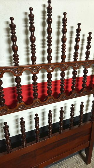 Elegante cama de 135 cm con un diseño clásico y acabados de madera maciza. Su estructura robusta y detalles ornamentales le dan un toque distinguido a cualquier habitación. - Estilo clásico - Madera maciza - Medida de 135 cm Colchón usado opcional, se puede incluir de regalo si interesa. También vendo dormitorio completo (cama completa, 2 mesitas de noche con encimera de cristal, cómoda con marquetería decorativa, espejo a juego y estantería a juego) por 750€.