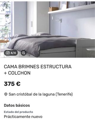 Se vende Cama de 90x190 + Colchón + Somier (150€ cada una, si compran las dos camas, las dejo cada una a 100€). Medidas Cabecero: ancho/alto 95/97cm. Pie: ancho/alto 95/52cm. Colchón Muelles (Limpio y sin manchas): ancho/largo/alto 90/185/20cm. Se puede suministrar también un juego de largueros para colchón de 90x200. Se le informa a las personas interesadas que los muebles tienen polvo de su almacenamiento. Venta solo en Canarias. Horario de contacto de 09:00 a 20:00 horas, durante toda la semana. Para una mayor agilidad, ponerse en contacto conmigo "ÚNICAMENTE" por medio de llamada o WhatsApp al móvil 621 309 443.