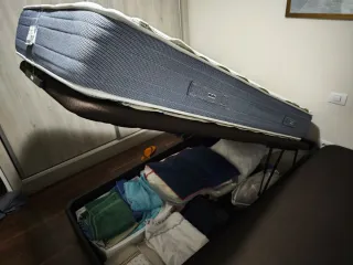 Se vende cama individual con sistema de arcón para almacenamiento y colchón. - Medidas: 90x190 cm. - Estructura de madera