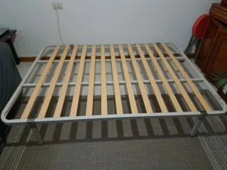Somier "de matrimonio" de 135cm con estructura metálica y láminas de madera. Firme y estable, está en perfecto estado salvo por esas marquitas de las patas (le di con alcohol pero no salen 😔) A recoger en el barrio de Conxo.