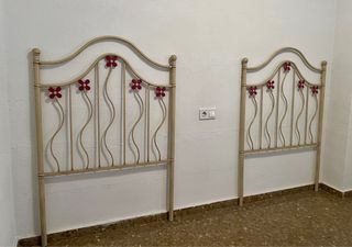 Se venden dos cabeceros de cama individual en buen estado. - Diseño con flores decorativas. - Estructura de metal resistente.