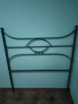 Bonito cabecero de forja con un diseño elegante y atemporal, perfecto para darle un toque especial a tu dormitorio. - Estructura de metal resistente. - Diseño con detalles curvos y un círculo central. - color verdoso claro con tonos dorados Medidas: 125cm de alto, 112 de ancho