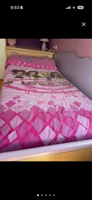 Conjunto de cama individual 1,80 x80 que incluye: - Cojín blanco con borde de pompones. - Colchón con colcha. - Base y somiers 2 CAMAS POR 130€