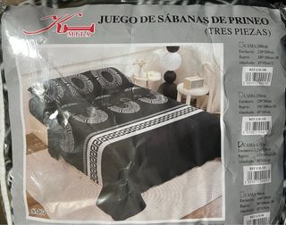 Lote de dos juegos de sábanas de pirineo, uno para cama de 135cm y otro para cama de 150cm. El diseño es en tonos negros y plateados. - Juego para cama de 135cm: Encimera 210x260cm, Bajera 135x200cm+30, Almohada 45x145cm. - Juego para cama de 150cm: Encimera 230x260cm, Bajera 150x200cm+30, Almohada 45x165cm.