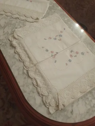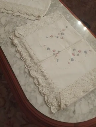 Juego de sábanas con un delicado diseño floral bordado. - Color base amarillo pálido. - Detalles en blanco con bordados. - Acabado con encaje en los bordes.