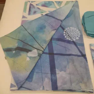 Funda nórdica para cama de 105cm con un diseño moderno de triángulos en acuarela, revertible - Diseño de triángulos en tonos azules, morados y verdes. - Tejido de tela, con automáticos.
