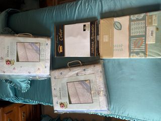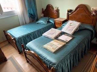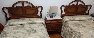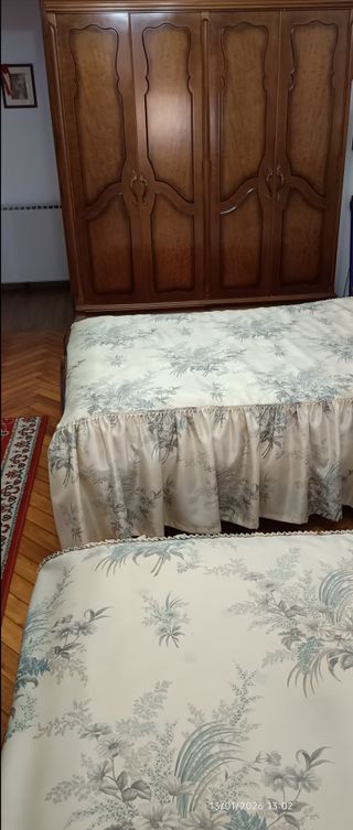 Conjunto de dormitorio con dos camas de 1,05m, una mesilla y un armario de 4 puertas. - Camas con cabeceros de madera tallada. - Mesilla con tapa de mármol y cajones. - Armario de 4 puertas con gran capacidad. Se regala: Colchones, colchas y cortinas