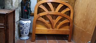 Cabecero y pies con sus largueros de cama individual de madera con un diseño curvo y detalles en forma de abanico y somien metálico - Medida: 90cm - Material: Madera - Color: Marrón
