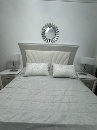 Conjunto de dormitorio que incluye cama, dos mesitas de noche y un mueble con espejo. - Cama de madera con cabecero. - Dos mesitas de noche de madera con cajones. - Mueble de madera con espejo.