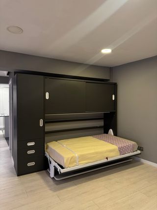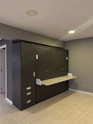 Mueble multifuncional con cama integrada. Sus dimensiones son 2 metros de alto por 2.60 metros de ancho. - Diseño moderno y funcional. - Acabado en madera y apliques en plástico.