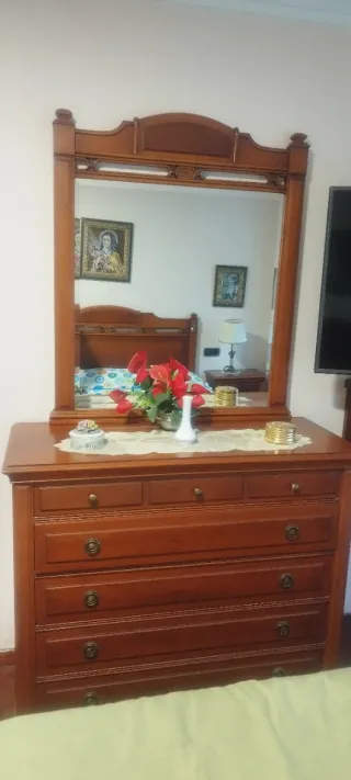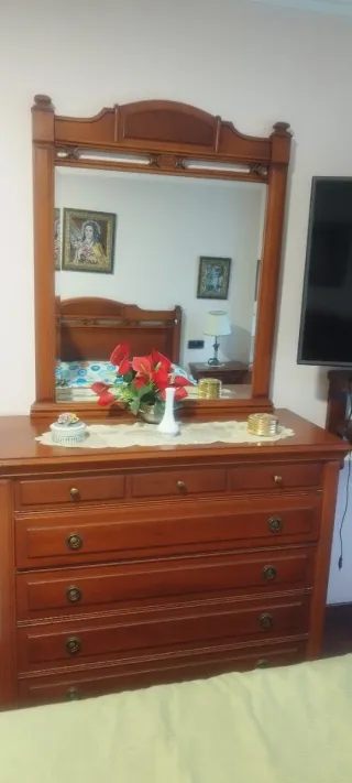 Elegante habitación de madera maciza con espejo. - Diseño clásico y funcional. - Amplio espacio de almacenamiento con cajones. - Acabado en tono cálido de madera.