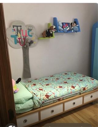 Cama nido con cajones de almacenamiento con un divertido diseño infantil, ideal para habitaciones de niños. Se encuentra en buen estado. Se entrega con dos colchones más fundas de colchón, dos juegos de sábanas,y una almohada.