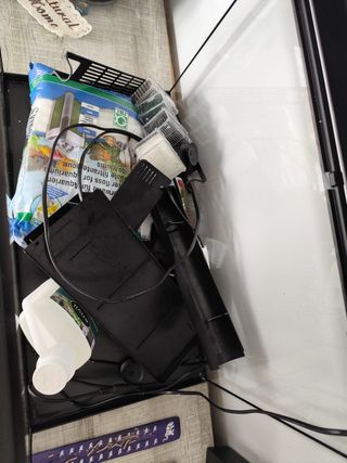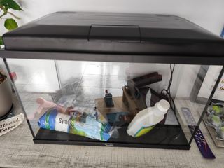 Pecera de 50Litros, con filtros recambios d 1 filtro,un poco de liquido para evitar algas,luz led en la tapa,2 botes por la mitad para acondicionar el agua y bacterias