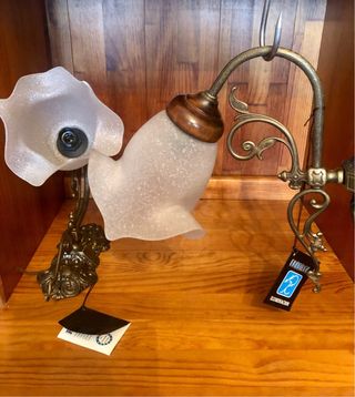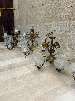 Conjunto de 6 lámparas de estilo vintage con detalles en bronce y cristal. - Diseño clásico y elegante. - Acabado metálico dorado. - Tulipanes de cristal esmerilado con motivos florales. Conjunto entero 80€ Unidad 15€