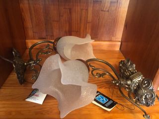 Set de dos apliques de pared con un diseño clásico y elegante. Aportan un toque de distinción a cualquier estancia. - Acabado metálico dorado. - Pantallas de cristal translúcido. - Detalles decorativos en metal. - Base de madera. - medidas: alto 28 cm x 31 de fondo. Liquidación de tienda.