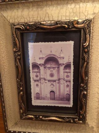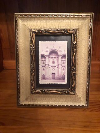 Elegante marco de fotos con un diseño clásico. - Acabado en beige con detalles dorados. - Marco interior con ornamentación. - Ideal para colgar o colocar sobre una superficie.mide 20 cm de largo x 25 cm de ancho. Restos de tienda.