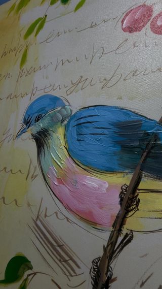 Cuadro decorativo con un diseño de pájaro y mariposa sobre un fondo claro con escritura. Tamaño 60x60 en perfecto estado - Representación artística de un pájaro azul y una mariposa naranja. - Elementos florales y de escritura integrados en el diseño. - Ideal para añadir un toque de color y naturaleza a cualquier estancia.