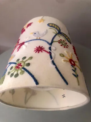 Pantalla de lámpara con un diseño encantador y colorido. - Decorada con bordados de flores y pájaros. - Base de tela blanca.mide15 cm de alto x10'50 en la parte de arriba x 14 en la parte de abajo
