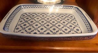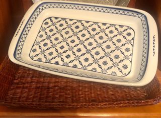 Elegante fuente de cerámica con un bonito diseño. - Base de mimbre tejida. - Decoración interior con motivos azules. - Borde con diseño de zigzag azul.mide de largo 46 cm x 28 cm de ancho x 6 cm de alto. La fuente es apta para horno, restos de tienda.