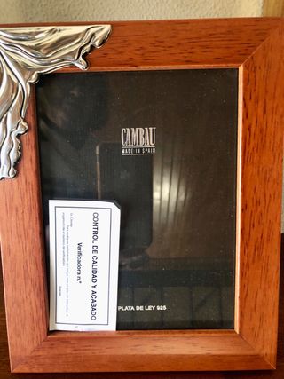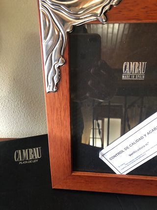 Elegante marco de fotos de madera con detalles decorativos en plata. - Fabricado en España. - Plata de Ley 925. Mide 20 cm de largo x 25 cm de ancho para foto de 13 x 18 cm . En su caja original aunque la caja está ligeramente sobada ( se aprecia en las fotos) restos de tienda
