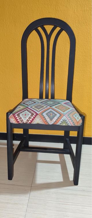 Conjunto de sillas de comedor con un diseño elegante y un tapizado llamativo. - Estructura principal de madera. - Asiento tapizado en tela con estampado geométrico. - Color de la estructura: negro. - Colores del tapizado: multicolor. Resistentes y muy cuidadas