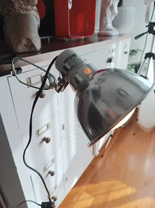 Lámpara tipo foco de aluminio con diseño industrial, montada sobre un trípode de acero y plástico - Estructura metálica plateada. - Base de trípode negra. No tiene cristal , es plástico. 170 cm de alto Con interruptor Se envía desmontado Es de aluminio y acero No Correos!!!! Album de cromos de futbol liga española Flexo aplique Panini mundicromo de la liga romántica fichas de la historia