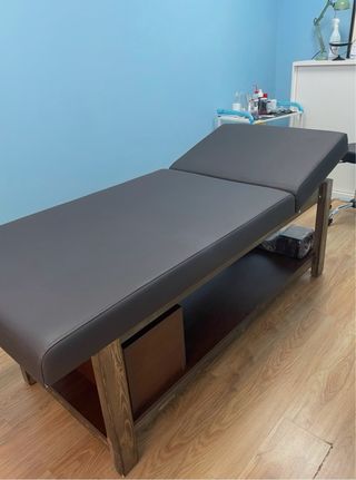Una camilla o divan ideal para dar servicio en una consulta, clínica o centro de estética o salud. -Piel color negro y edtructura de madera -Cabecero reclinable -Como nuevo