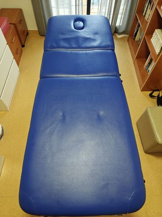 Camilla de fisioterapia plegable en buen estado, utilizada siempre para tratamientos profesionales en domicilio. Estructura de madera y acolchado de polipiel azul. Incluye todos los accesorios originales y la funda original, esta última con desgaste por el uso. La estructura presenta un daño, tal y como se aprecia en las fotos. Se le realizó un refuerzo metálico, visible también en las imágenes, aunque el daño persiste y actualmente le faltan algunos tornillos por colocar.