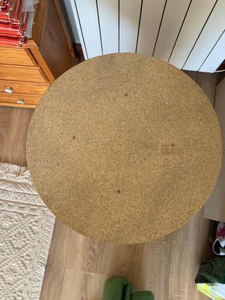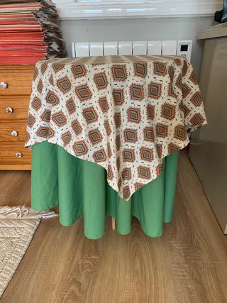 de madera opción funda y tapete de tela de tapicería. Si interesa vendo solo la funda y el tapete o la mesa sin vestir, se admiten ofertas. Diámetro 50 cm.
