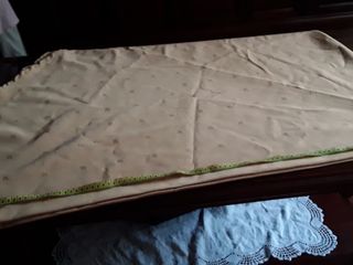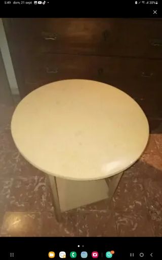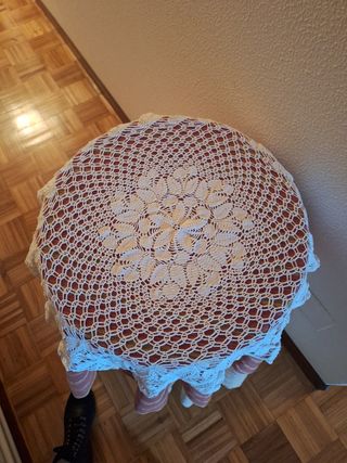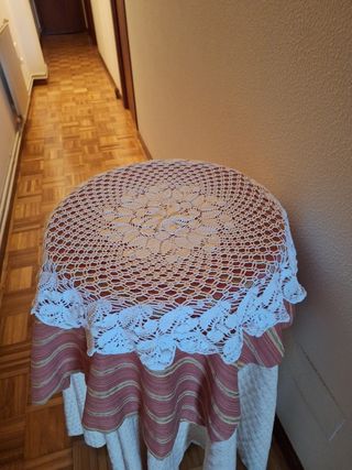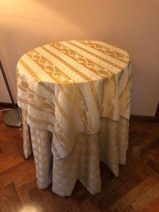 Se vende mesa auxiliar ya con los dos manteles. Mesa auxiliar, mesilla, mesa para salita… mesa camilla aproximadamente 62 cm de alto y 50 cm de diámetro