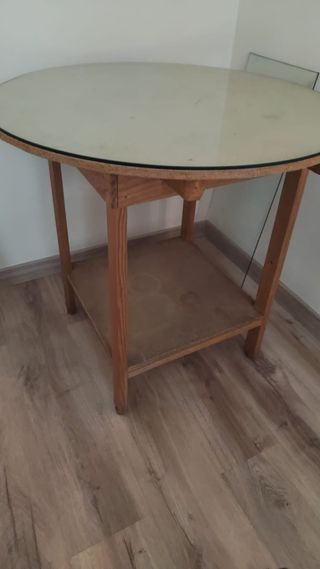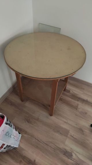 Mesa camilla redonda con un diseño sencillo y funcional. - Tablero redondo. - Estructura de madera con balda inferior. - Tengo dos iguales.