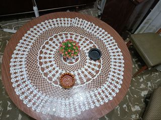 Mesa camilla de 90 cm diámetro y 72 de alto ,para sofa,con cristal y faldas