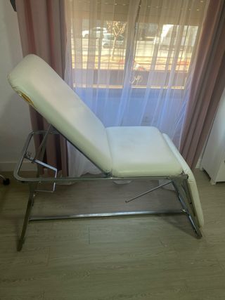 camilla de estética, con respaldo y pies regulable. Tiene desgaste de los años pero con una funda se arregla,es muy buena camilla.
