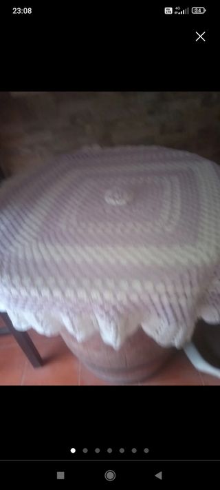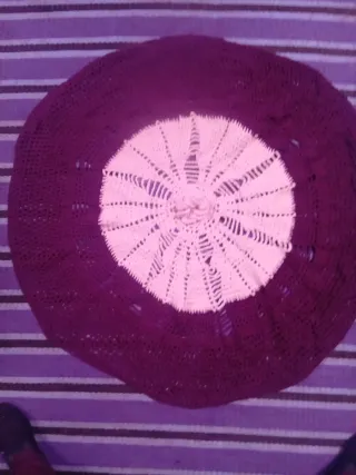 Mantel artesanal para mesa redonda tipo camilla, decoración color 🟪 y 🤍, diámetro 1,20, echo artesanalmente con lana macramé,no acepto regateos