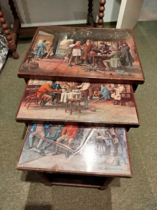 Conjunto de mesas camilla vintage con preciosas escenas venecianas. - Diseño original. - Acabado en madera y cristal.
