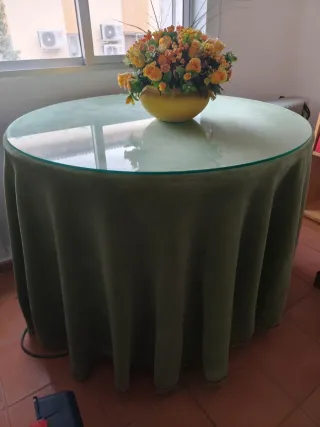 Mesa camilla con tarima de 80 cm de diámetro con hueco para calefactor. Tablero y cristal de grandes dimensiones 120 × 140 cm X 67 cm Material de la mesa es aglomerado, pero como no he encontrado entre los descritos, he tenido que marcar microfibra. Vendo tarima, mesa y cristal. No vendo las vestiduras.