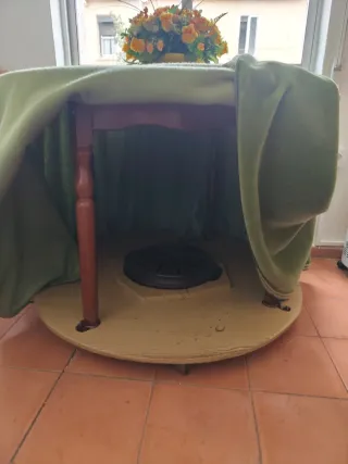 Mesa camilla de 100cm redonda con cristal, faldilla y brasero, todo por 50€.