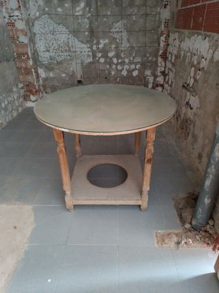 Mesa con pata central de 90 cms.de diámetro cerrada,lleva un suplemento central de unos 30 cms.aproximadamente(no la hemos abierto nunca),la vendo porque la voy a cambiar por una mesa camilla.