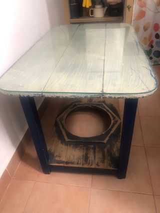 Amplia y práctica mesa camilla con su paño de chenilla a medida, en tono crema que va con todo. Tiene hueco abajo para poner estufa. Medidas de la mesa: 110 cm ancho/ 60 cm fondo/ 74 cm alto. Puedes ver más artículos en mi perfil. Gracias.