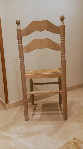 Conjunto de cuatro sillas de enea con un preparado para que sea más resistente, en color natural. Son muy resistentes y pesan un poco para evitar las caidas fáciles. Tenen un acabado pulido que las hace super limpiables. Se ven estupendas en la cocina, en un patio, terraza e incluso para cualquier estancia de estar, alrededor de una mesa camilla, etc. Están sin estrenar. No se han utilIzado nunca. Son superlimpiables, tienen un acabado especial de pintura, pero conservan todo su atractivo de estilo español. Se venden también por parejas. PREGUNTE. ES UNA ESTUPENDA OCASION DE COMPRA. SE REGALA con ellas un cristal en