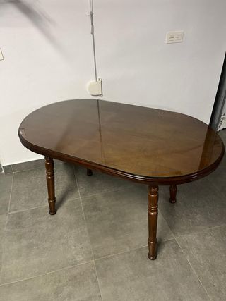 Elegante mesa de salón con tapa de cristal y base de madera. - Diseño ovalado. - Medidas 135x80 - Se incluye cristal. - Posibilidad de convertir en mesa camilla, ya que la tapa tiene espacio para ponerlas por debaje de ella. - Patas de madera torneada.