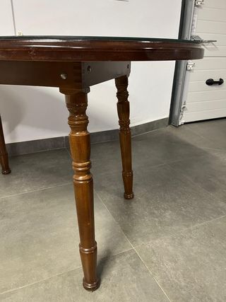 Mesa camilla desmontada. -Tablero de Madera recia, no es conglomerado. -Redonda 120cm. Extensible para hacerla ovalada, 30cm más. -4 patas atornillables, también de la misma madera. -Incluye cristal redondo de 120cm -Incluye además enaguas. -No tiene tarima. Recogida en mano en Zaidín, Granada.