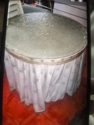 Mesa camilla redonda con un diseño elegante. - Cubierta de cristal con un patrón decorativo. - Falda de tela con un diseño sutil. Más información al 640779461