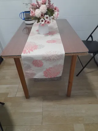 Mesa de comedor de madera maciza de 1.40x90cm extensible a 2.45cm con cristal y ropa de camilla