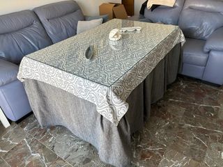 Se vende mesa salón ovalada de madera color nogal y cristal fume ,lista para dejarla sin ropa camilla (incluida está) si lo desea, en muy buen estado 108 cm por 80 cm..