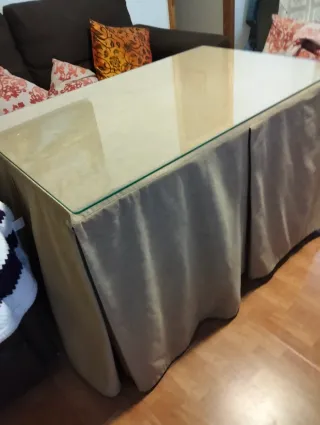 Mesa camilla con una cubierta de tela en color beige y tapa de cristal. Medida 120x70x70 - Cubierta de tela con plisados. - Tapa de cristal.