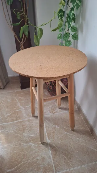 Mesa de camilla pequeña. Sirve como mesita de noche o supletoria para un lado del sofa con una lamparita. Se puede pintar para dormitorio. Esta sin barnizar.
