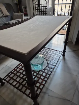 Mesa camilla completa estructura de forja, tablero y tapa de cristal. - Diseño elevable. - En color blanco - Con la ropa y el tapete. Se vende completa con la ropa. Está nueva sin usar. Comprada por equivocación.